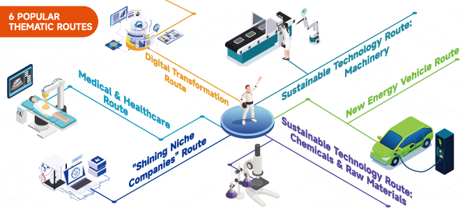 Based on the latest hot topics about sustainable technology, new energy vehicle, "Shining Niche" Companies, digital transformation and medical & healthcare, visiting routes are designed to cover focal technologies and concurrent events in order to create pleasant and fruitful visiting experience to all visitors. |