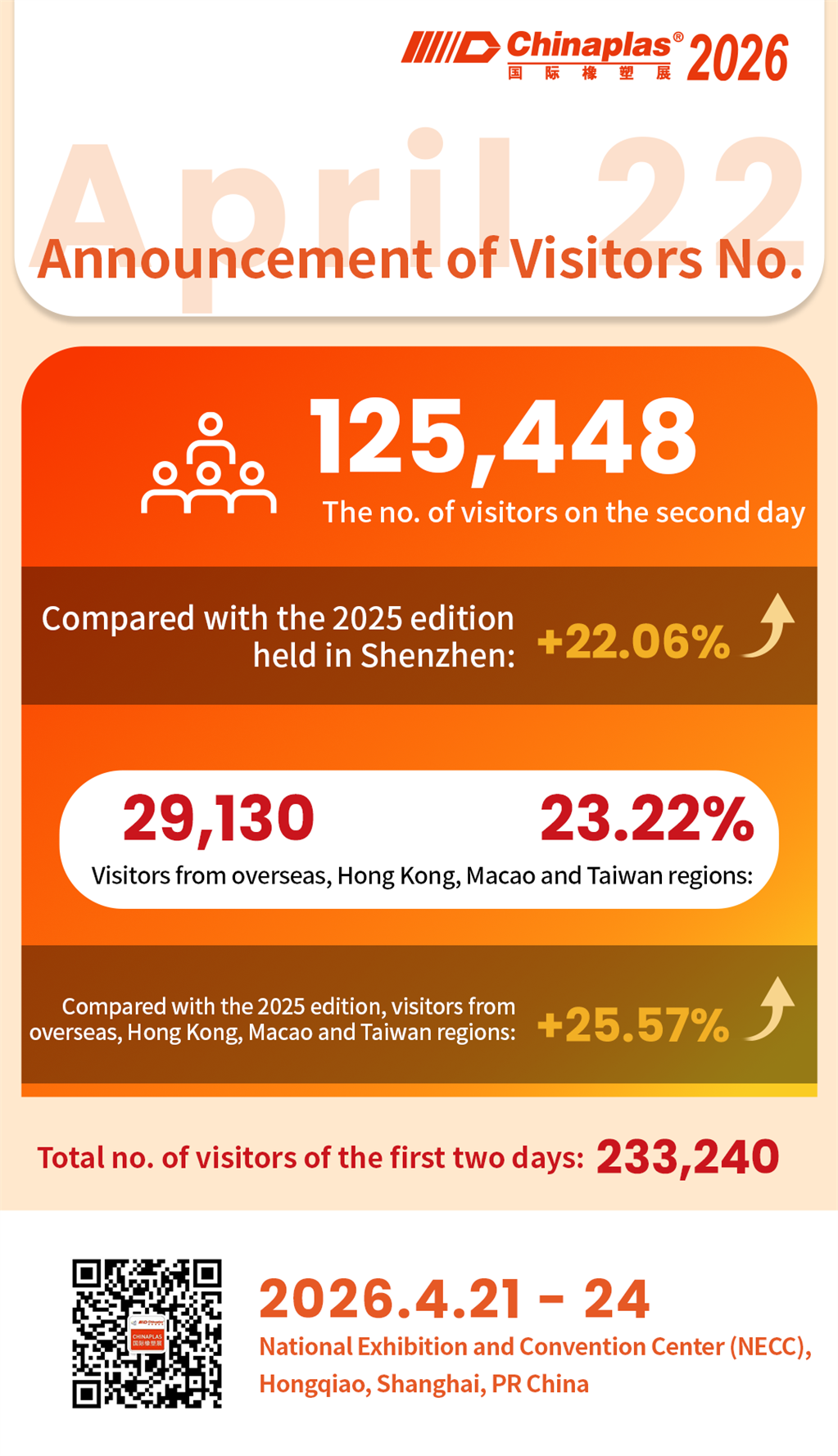 CHINAPLAS 2026 drew 125,448 visitors on Day 2, bringing 233,240 visitors for the first 2 days.