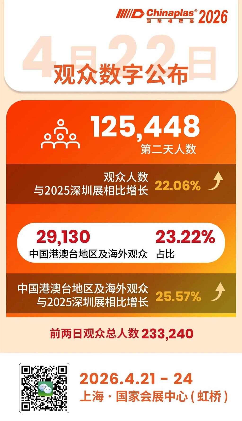 CHINAPLAS 2026第二天观众人数录得125,448,首两天观众人数合共达233,240!