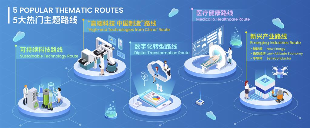 Based on the latest market hot topics about sustainable technology, "High-end Technologies from China", digital transformation, medical & healthcare and emerging industries, 5 visiting routes are designed to cover focal technologies and concurrent events, creating a pleasant and fruitful visiting experience for all