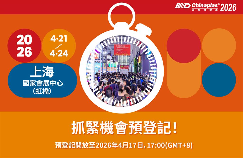 預登記還剩下一星期!全球領先橡塑盛會CHINAPLAS 2026 國際橡塑展即將震撼登場!5,000家國際展商將於4月21-24日匯聚上海國家會展中心(虹橋),在總面積高達 390,000 平方米展會中帶您一覽橡塑業界最新的尖端技術與破格解決方案。無論是尋找新材料、新設備還是新商機,都不容錯過。