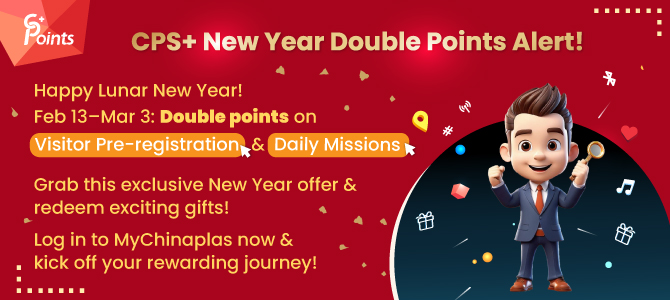Happy Chinese New Year! From February 13 to March 3, enjoy double points on both Visitor Pre-registration and Daily Tasks! Make your industry sourcing with more fun and rewards in the limited-time boost. Grab exclusive New Year perks to rack up points faster and redeem exciting gifts. The top plastics & rubber event, CHINAPLAS 2026, is even better when is shared with colleagues and friends! Log in to your MyChinaplas account now and kick off your rewarding journey!
