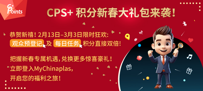 恭贺新禧,CPS+ 积分于2月13日至3月3日期间推出限时狂欢:完成“观众预登记”任务及“每日任务”,积分直接双倍!让您的工业采购更有乐趣,享受更多优惠。把握新春专属机遇,快速累积积分,兑换更多惊喜豪礼。参与橡塑产业顶尖盛会 CHINAPLAS 2026,让您与好友一起解锁独家福利!立即登入 MyChinaplas 账户,开启福利之旅,抢先赚翻!*活动受条款约束。