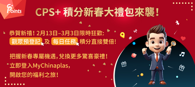 恭賀新禧,CPS+ 積分於2月13日至3月3日期間推出限時狂歡:完成「觀眾預登記」任務及「每日任務」,積分直接雙倍!讓您的工業採購更有趣,享受更多優惠。把握新春專屬機遇,快速累積積分,兌換更多驚喜豪禮。參與橡塑產業頂尖盛會 CHINAPLAS 2026,讓您與好友一起解鎖獨家福利!立即登入 MyChinaplas 賬戶,開啟福利之旅,搶先賺翻!*活動受條款約束。
